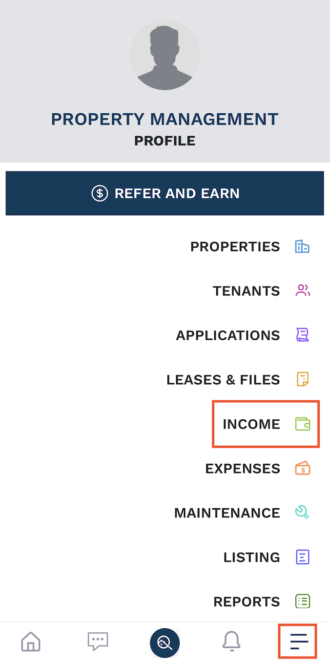 1. Click the 3 horizontal lines on the bottom right hand corner and select‘Income’.