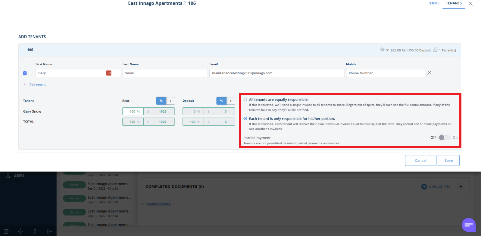 If you have multiple tenants on a lease, you can set invoices to either be shared or split by individual tenants. You can make these selections when adding a new tenant or when editing terms of an existing lease from the Leases & Files page. For more information on editing lease terms, please click here.