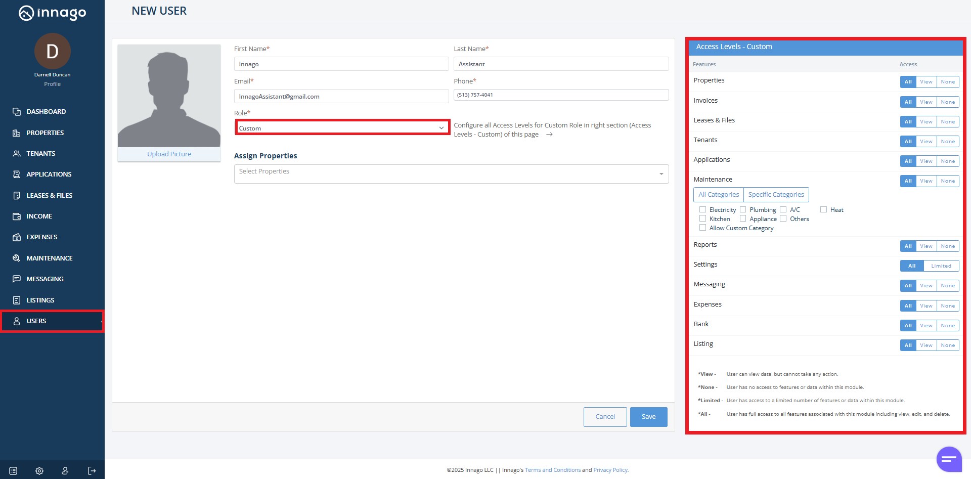 When creating a sub-user, if the preset roles do not provide you the level of control you require, you can easily create custom permissions using the custom role option. You can set varying access levels for all the features in your Innago account which are listed on the right-hand side of the screen.