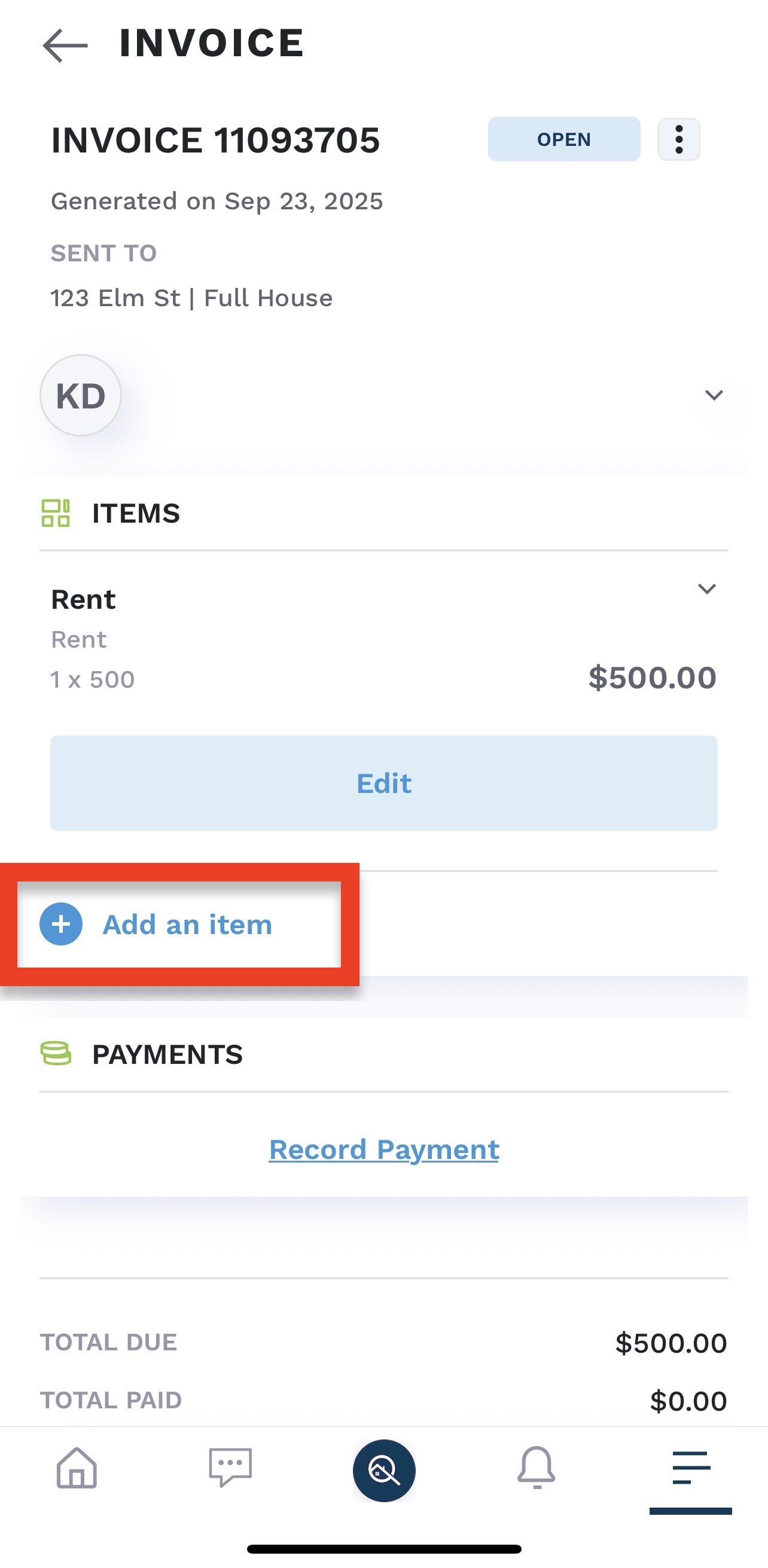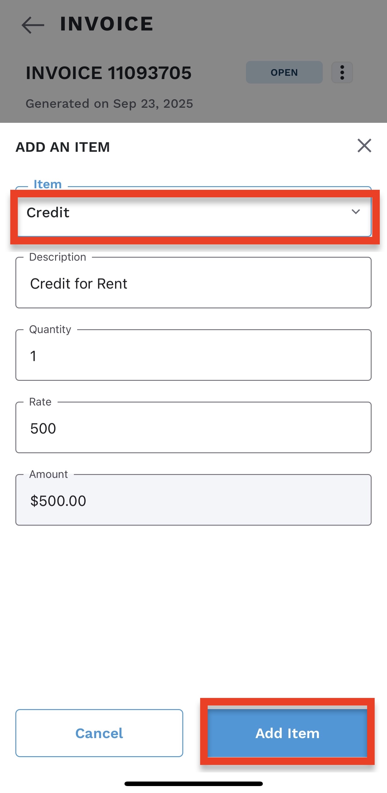 2. Click “Add an Item” on the invoice.