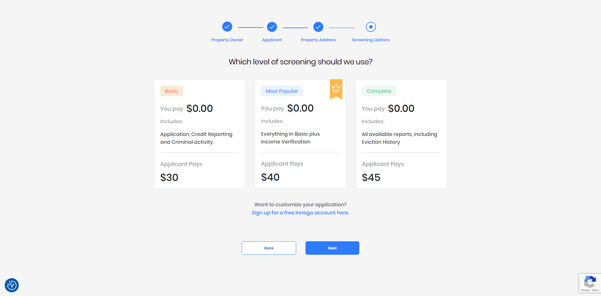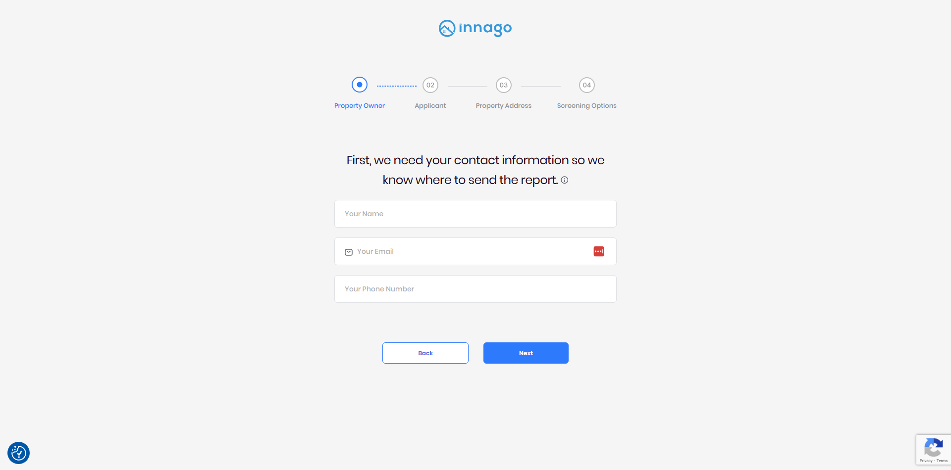 Individuals without an Innago account can also request applications and background checks directly from the home page. Applicants will fill in their information and the results will be emailed back to the requestor.