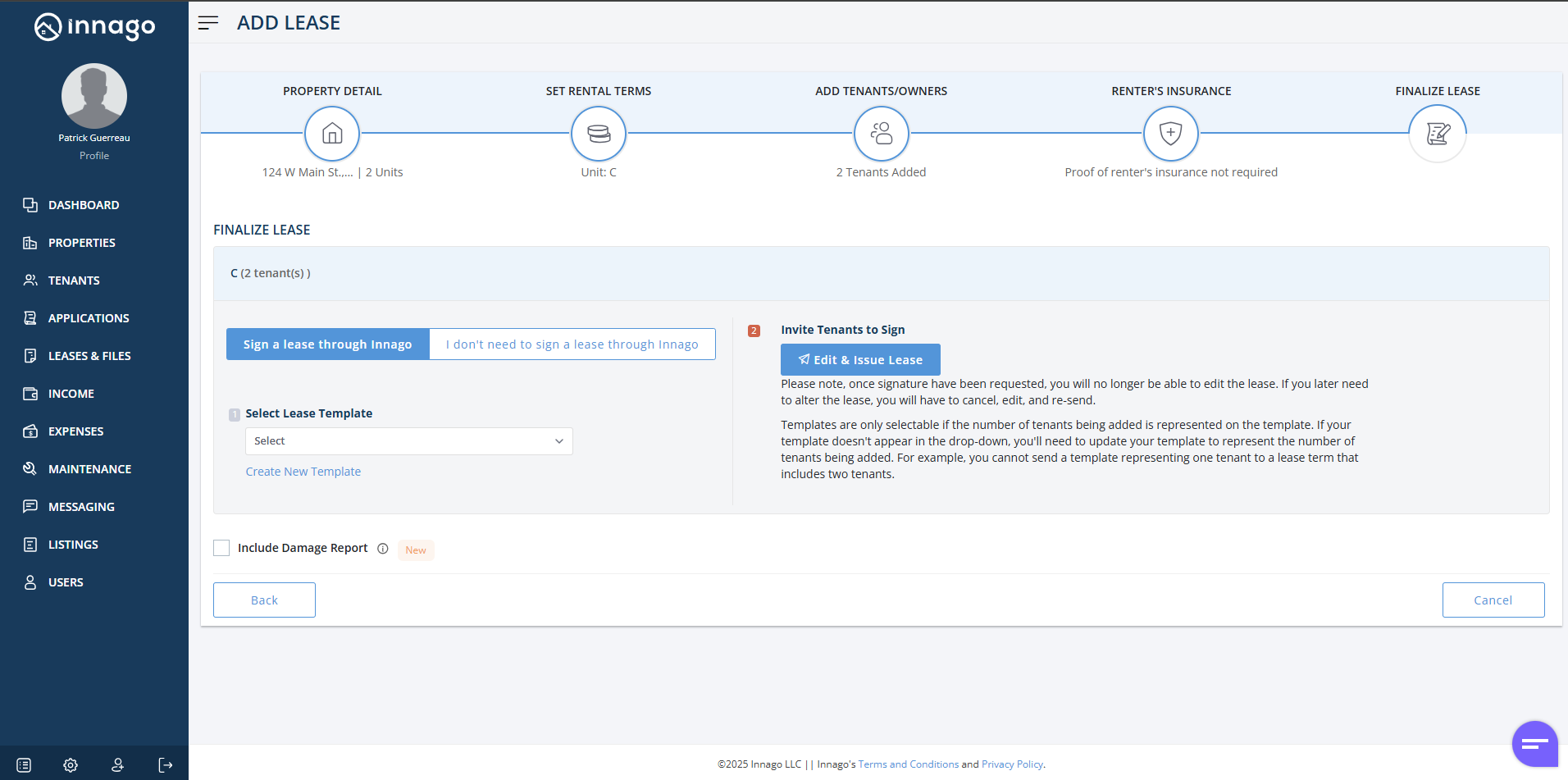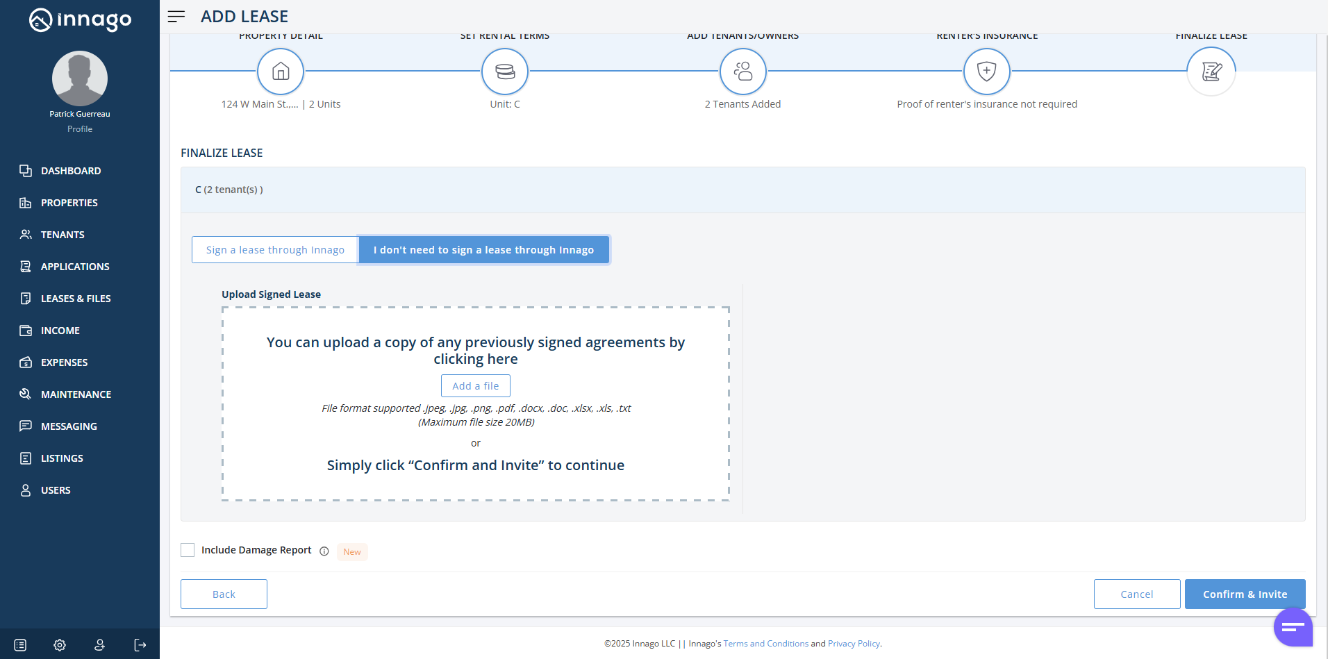 If you’re not ready to send a document, or do not need to send one you can select the option “I don’t need to sign a lease through Innago”. You can also select this if you have already signed a document offline and would like to upload it. Keep in mind, you can always send or upload a document later on if needed. Click “Confirm & Invite” once you’re finished.