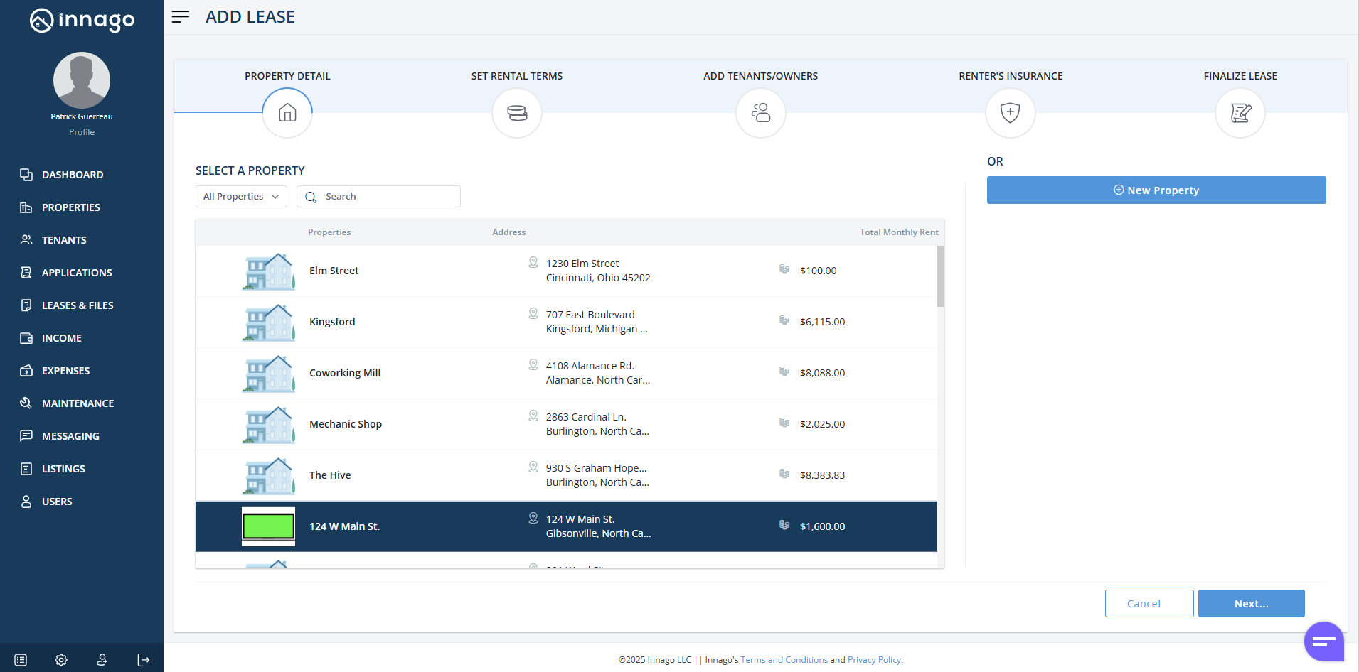 2. Select the property to which you’d like to add tenants and click the “Next” button. If your property has not been added to Innago yet, click the “New Property” button to add it now.