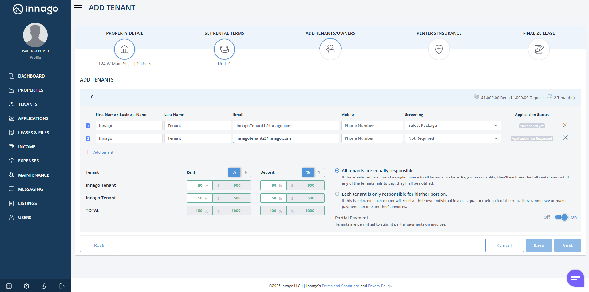 Please note, if you add a tenant profile with an email address, they will be emailed an invitation to activate an account with Innago once you’ve finalized the lease term. If you exclude an email address at this step, you can always add one later on to invite the tenant.
