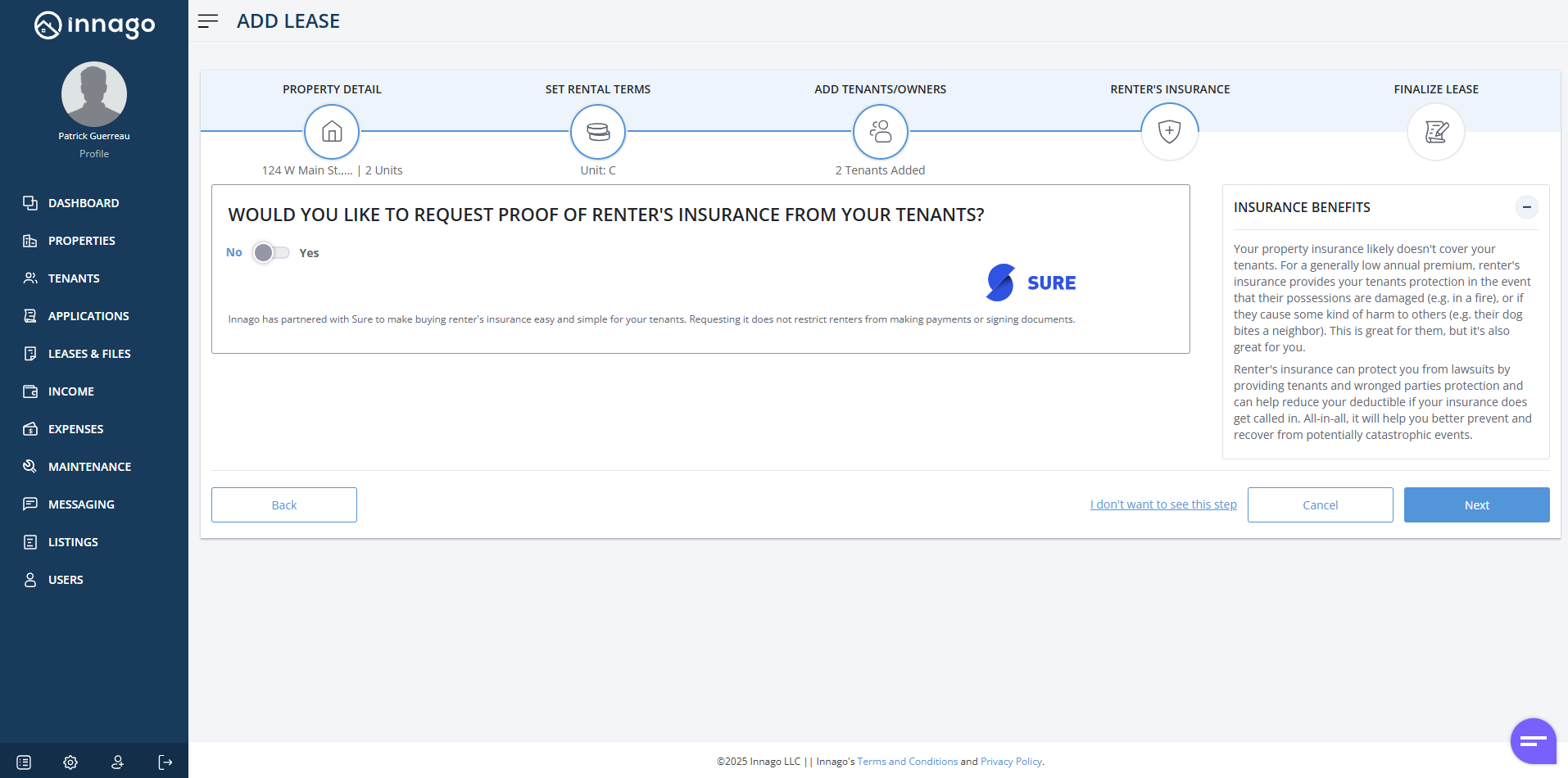 6. On the following screen, you will be able to choose whether or not you want to require renter’s insurance from your tenants. You can click here to see how the process for purchasing or uploading insurance will look from the tenant’s end.