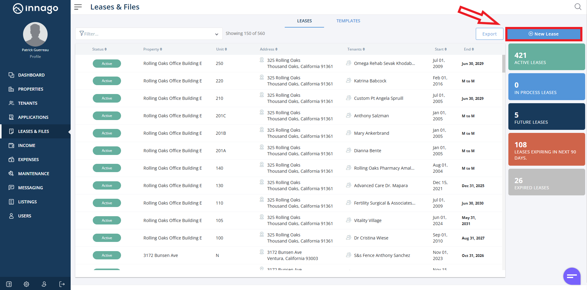 1. From your Dashboard, click “Add Tenants” in the upper-right-hand corner, or click “Leases and Files”. If you clicked “Leases and Files”,  click “New Lease” on the following screen.