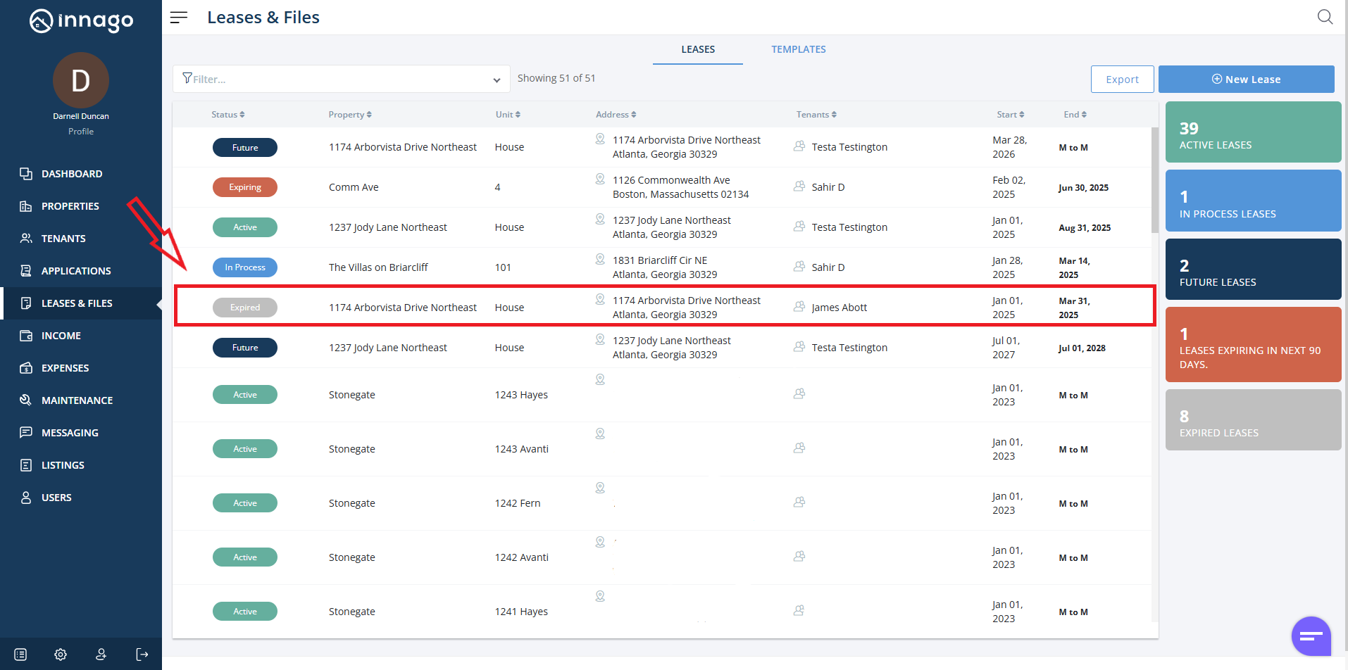 2. Select the expired lease term you would like to archive by clicking anywhere within the row that includes its details: