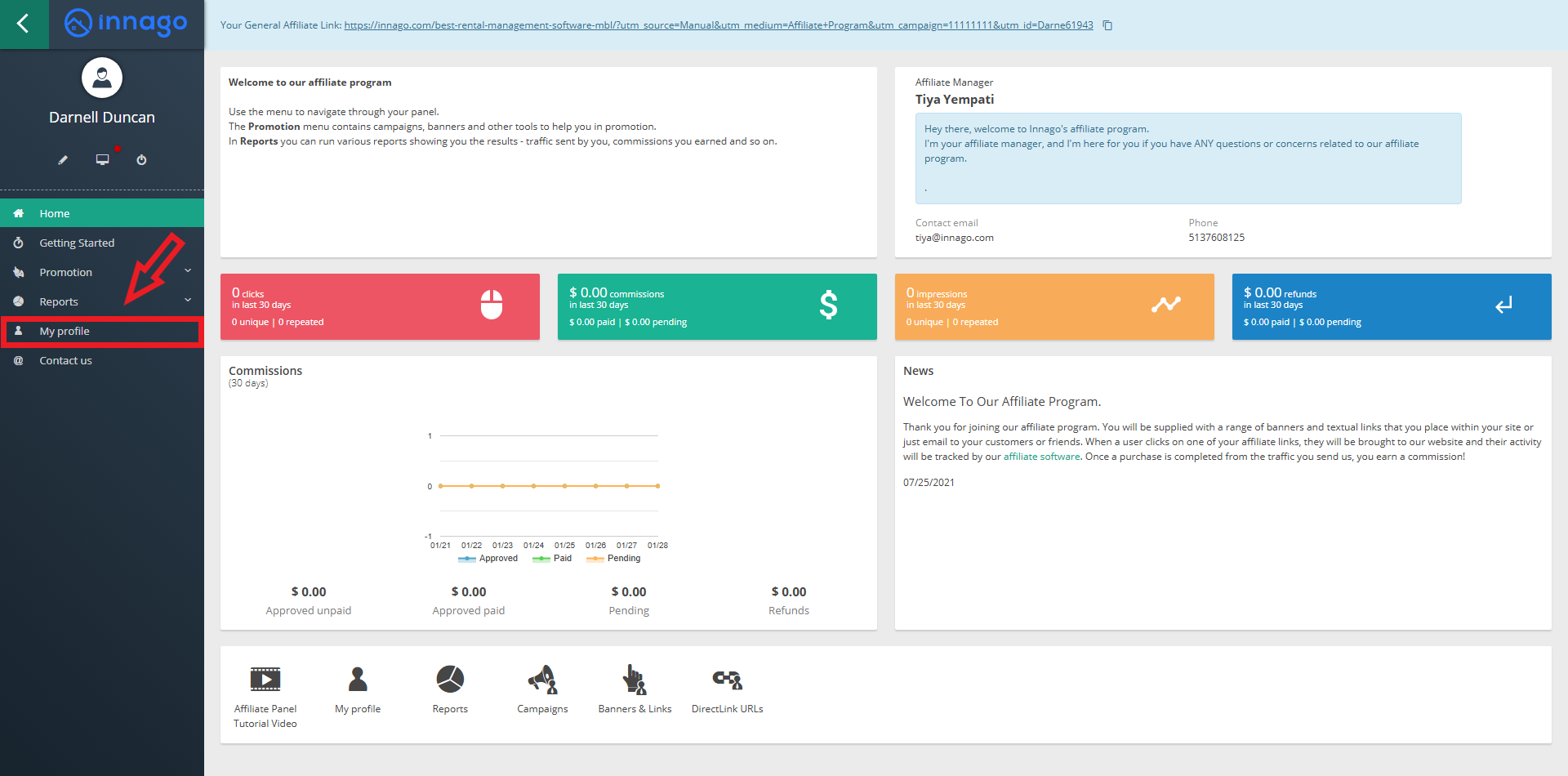 From the affiliate portal home page, you’ll click “My Profile” on the main menu located to the left of your screen.