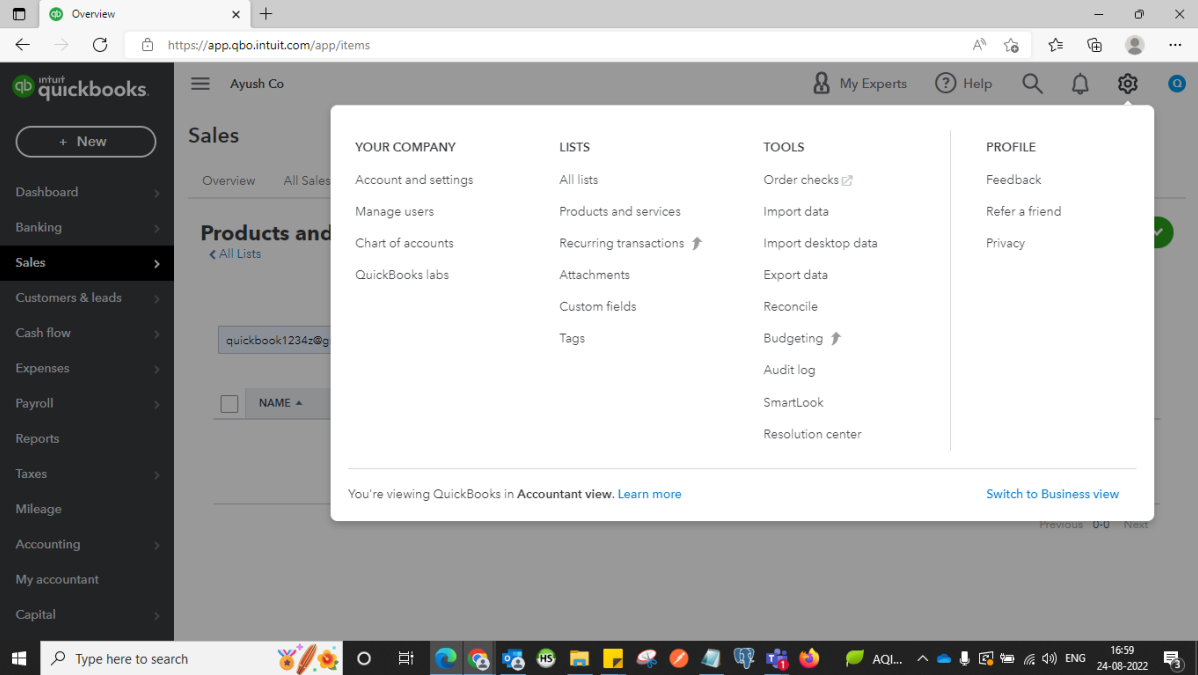 Once the account is created on QuickBooks click on the settings button (gear icon).