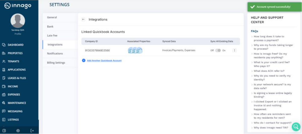 The following screen will show you all of your currently linked Quickbooks accounts. Here you can review the Company ID, any associated properties, and which data is being synched. If you would like to sync existing data, you’ll have the option to toggle on the selection from here as well.