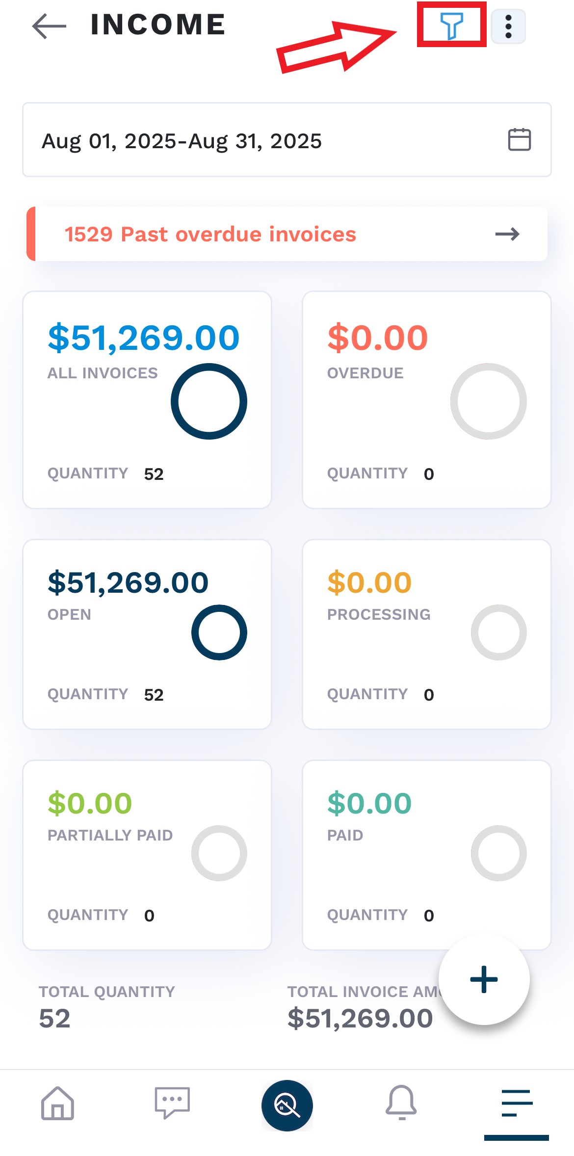 If you’re on the mobile app, as soon as you visit the Income page, you’ll see a bunch of pre-made “status filter tiles” that you can tap on. You can tap on one of those to immediately filter by the given invoice status, or you can tap the filter icon towards the top right of the screen to view more filters: