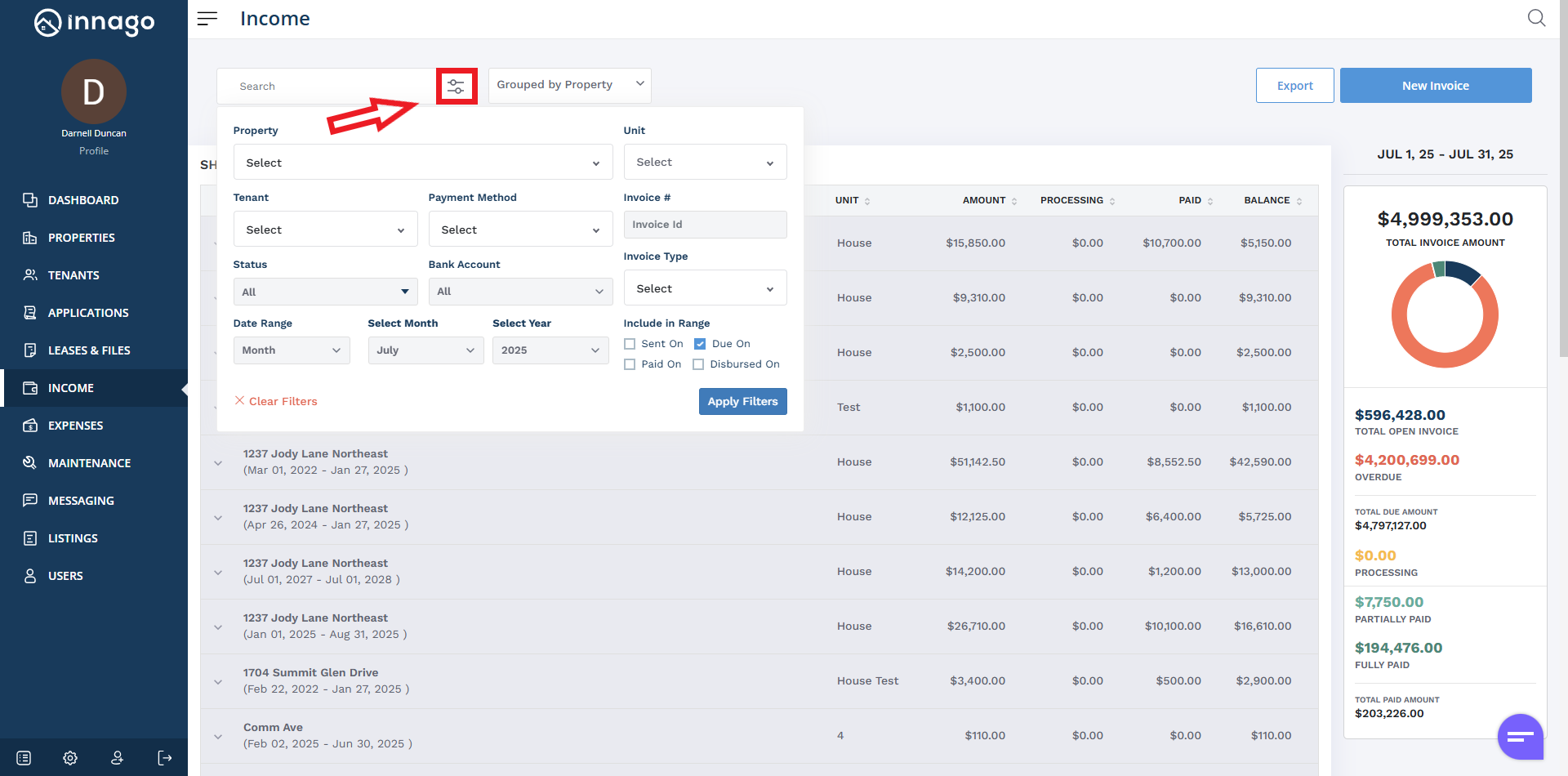 7. Bank Account – if you use more than one bank account to collect funds in Innago, you can view invoices for bank accounts, or one specifically.