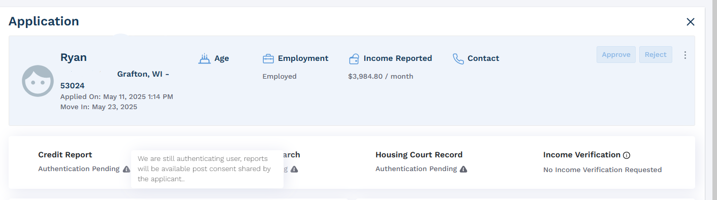 If you happen to see a pending application that specifically says “Authentication Pending”, this just means that the applicant needs to access their application and consent to sharing their reports with you. Our screening partners, Experian, require that all applicants review their reports and give formal consent to share them with you. This provides an extra level of protection to you as a landlord considering potential tenants, ensuring that we are all respecting and upholding the tenant’s privacy rights.