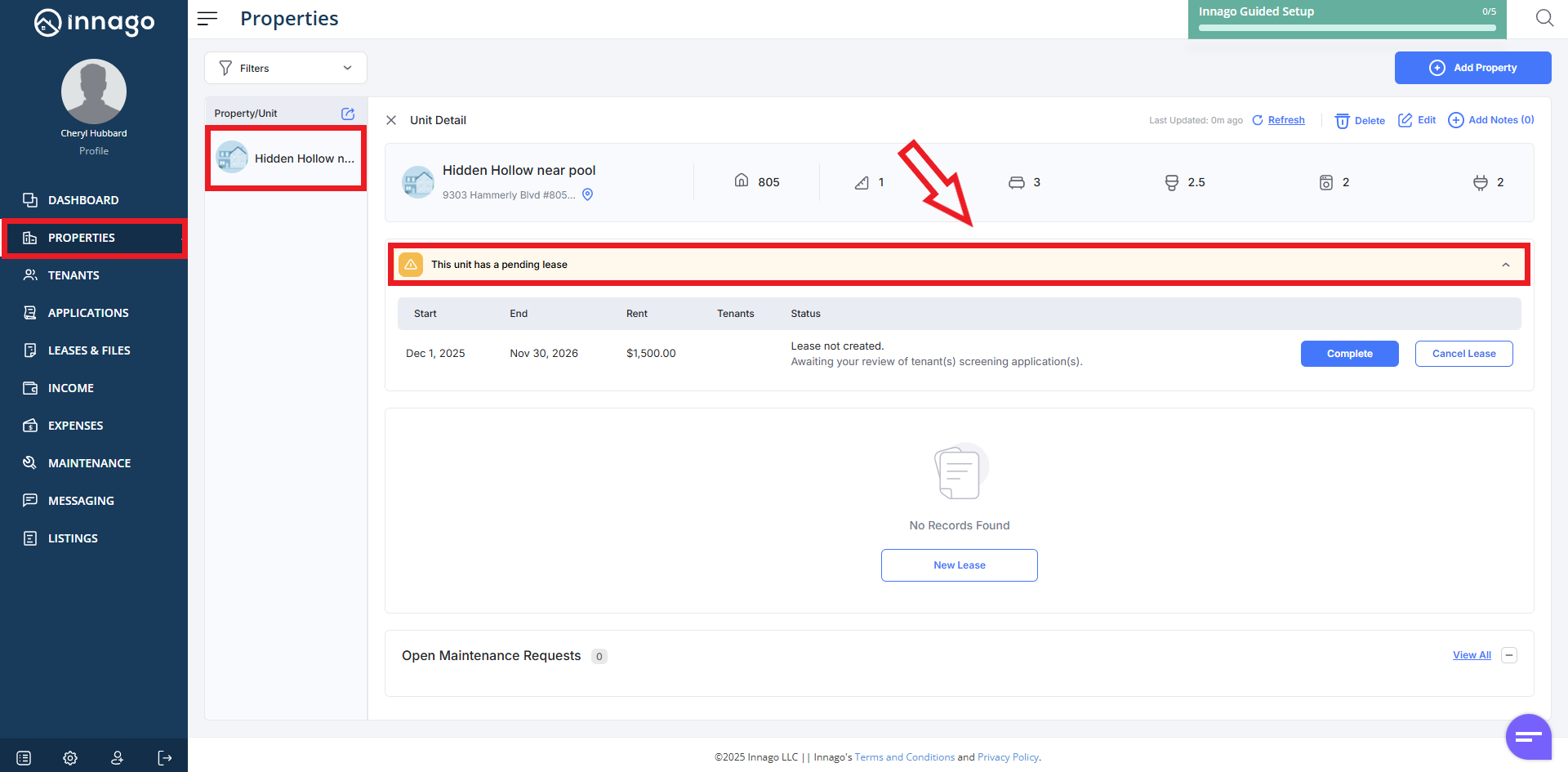 If there is no visible, active lease term, this likely means that there is a pending lease that you’ve already started in the system. You’ll just visit your Properties page, select the property (or unit, if there’s multiple units), then click “This unit has a pending lease” as shown below: